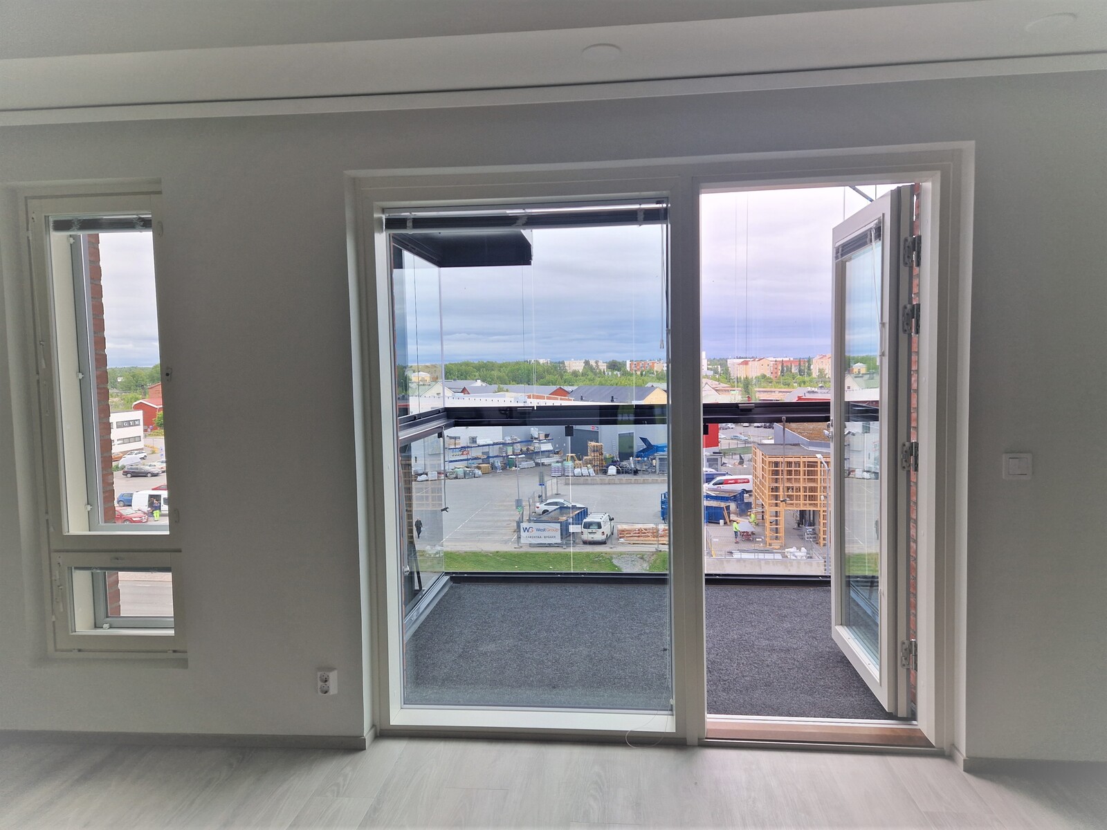 Olohuoneen kuvausHuoneesta kulku lasitetulle tilavalle lounais parvekkeelle. Seinät maalattu.