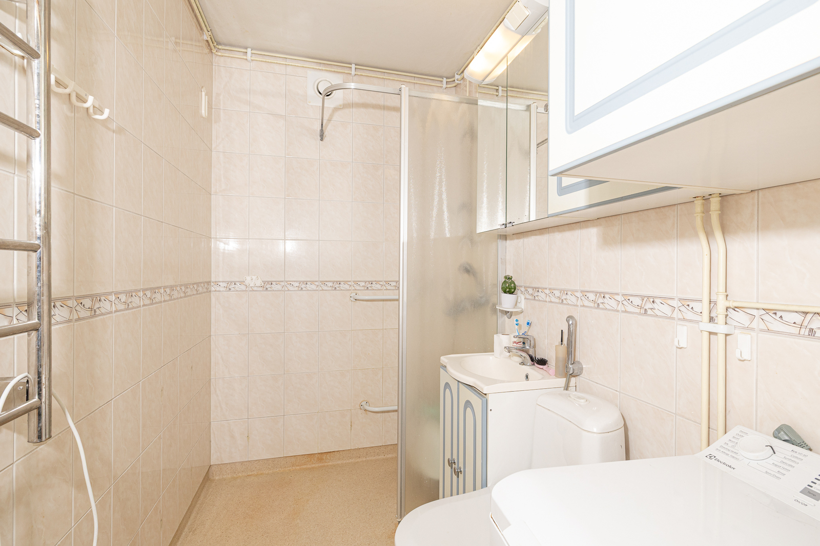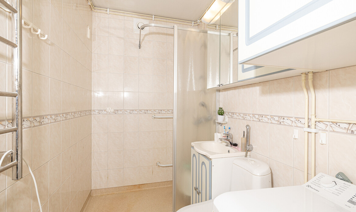 Varusteet: suihkuseinä, pesukoneliitäntä, peili -