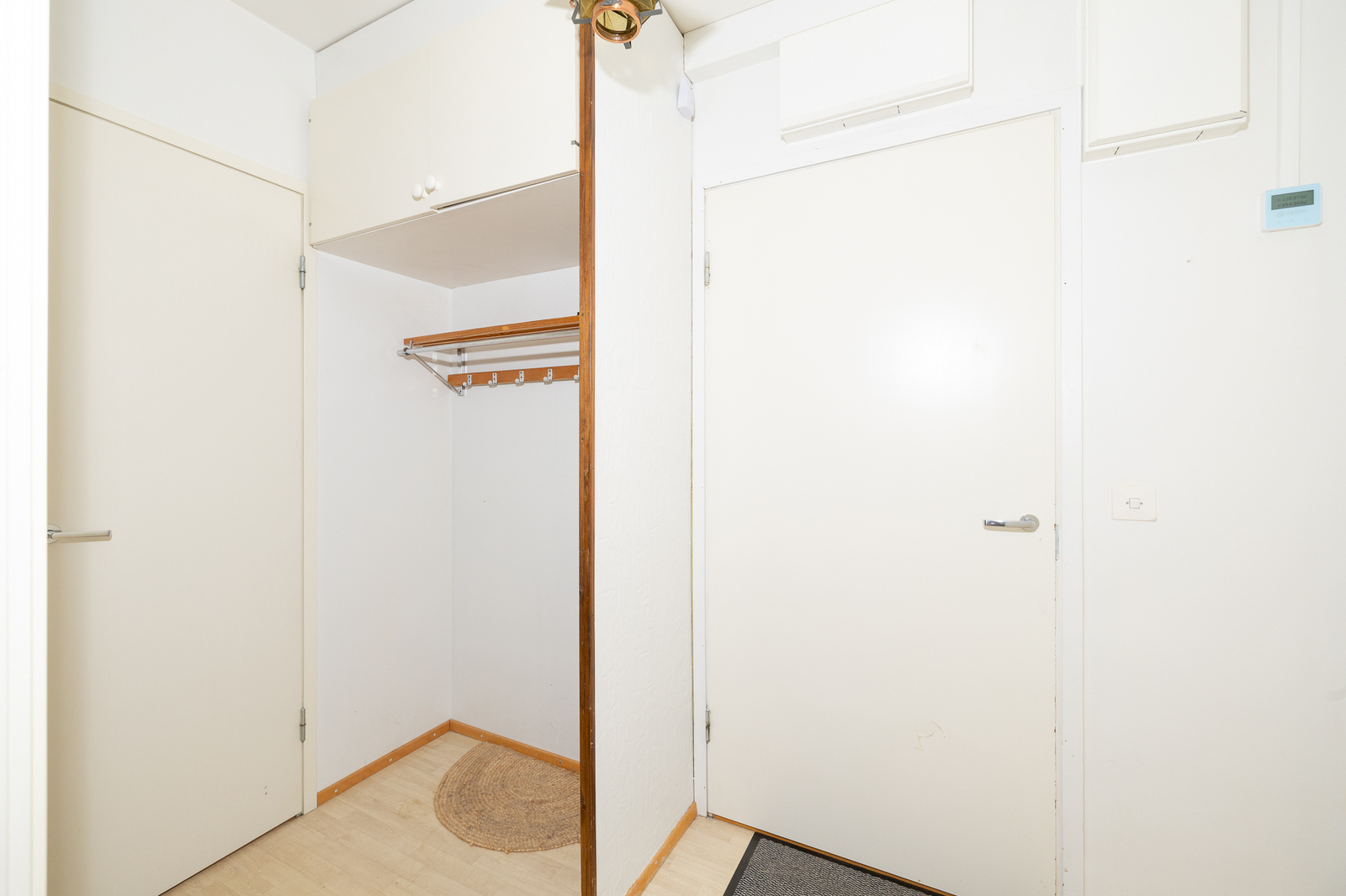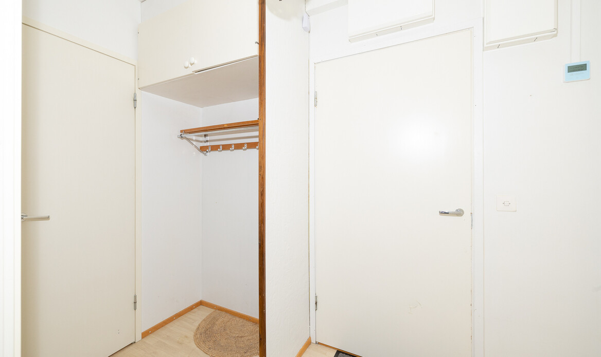 Den inglasade balkongen fungerar som ett bra extra utrymme från våren långt in på hösten och erbjuder en lugn plats för avkoppling. En praktisk klädkammare bidrar för sin del till en fungerande vardag.