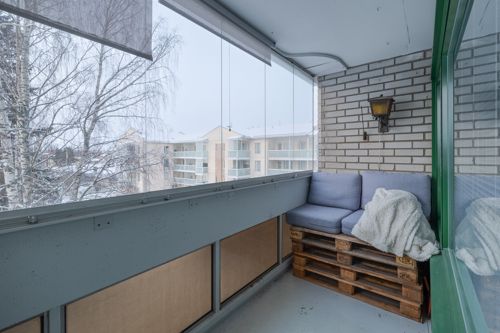 Lasitettu parveke toimii hyvänä lisätilana keväästä pitkälle syksyyn ja rauhallisen paikan rentoutumiseen.