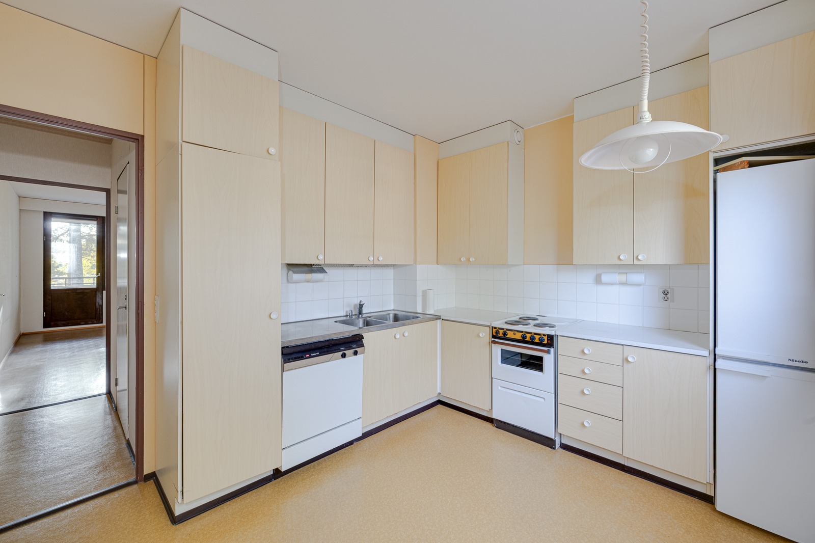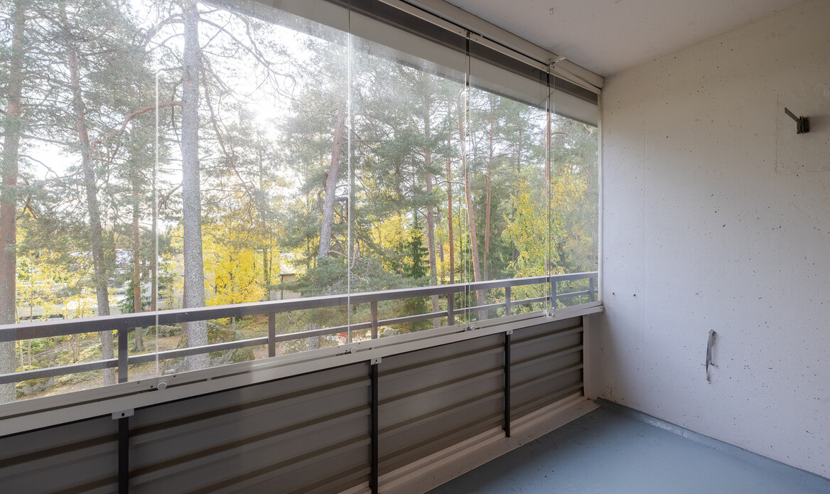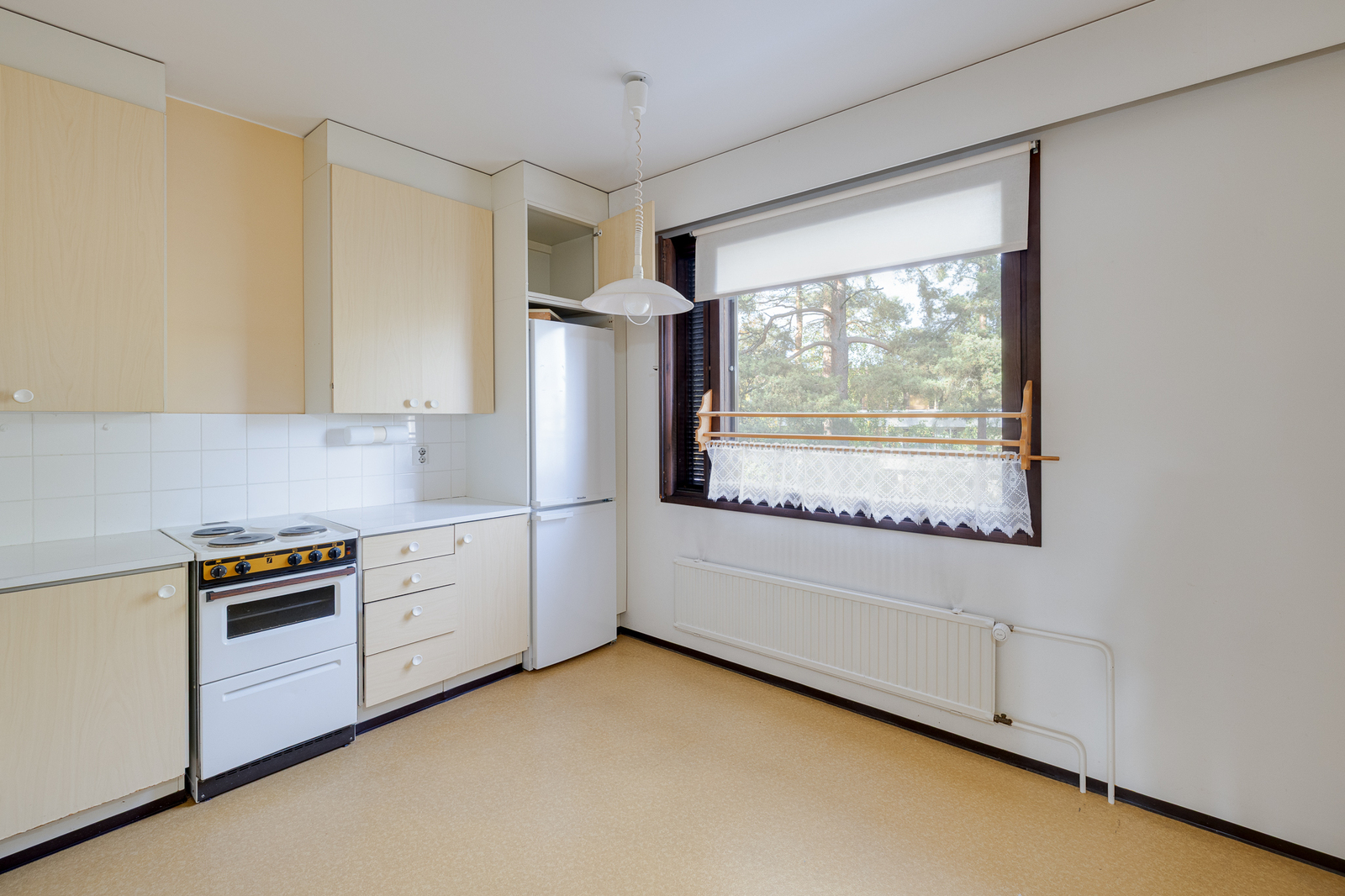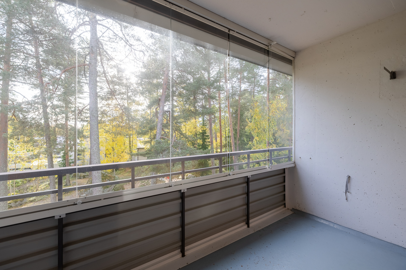 Huoneisto on alkuperäiskuntoinen ja pinnoiltaan ikäänsä nähden siisti. Jää-/pakastinkaappi uusittu jokunen vuosi sitten. Avarasta olohuoneesta käynti lasitetulle parvekkeelle, josta metsäinen näkymä.