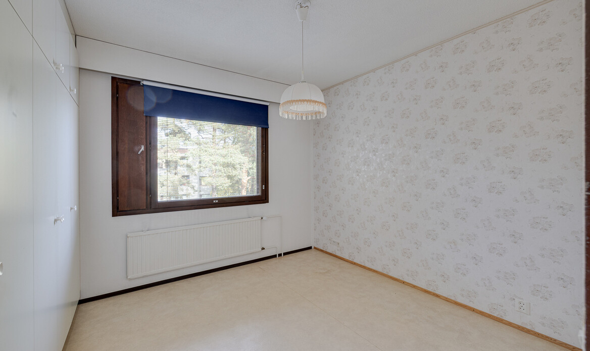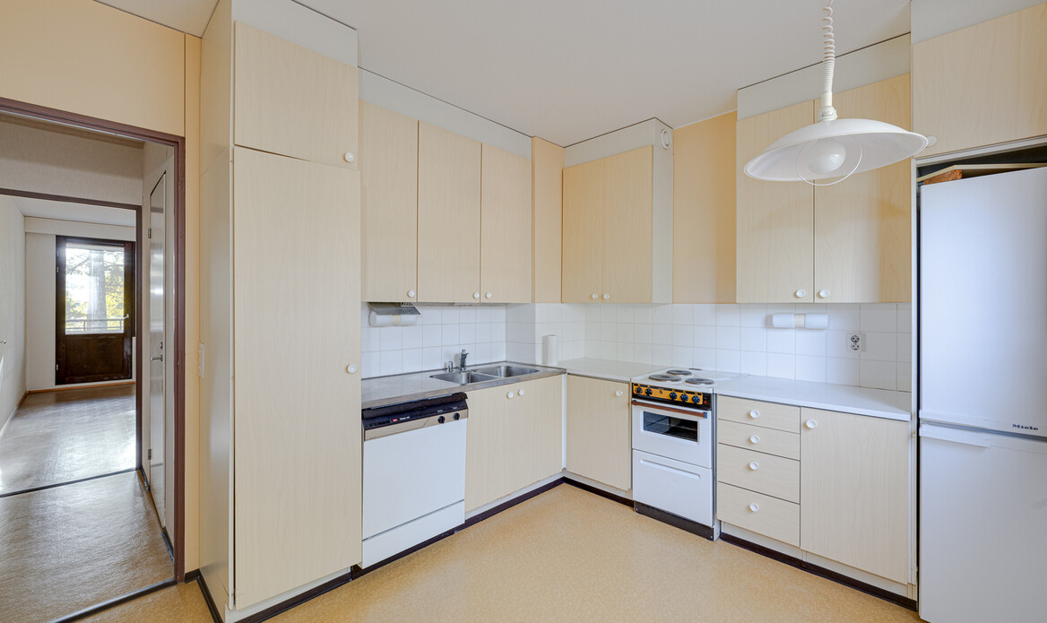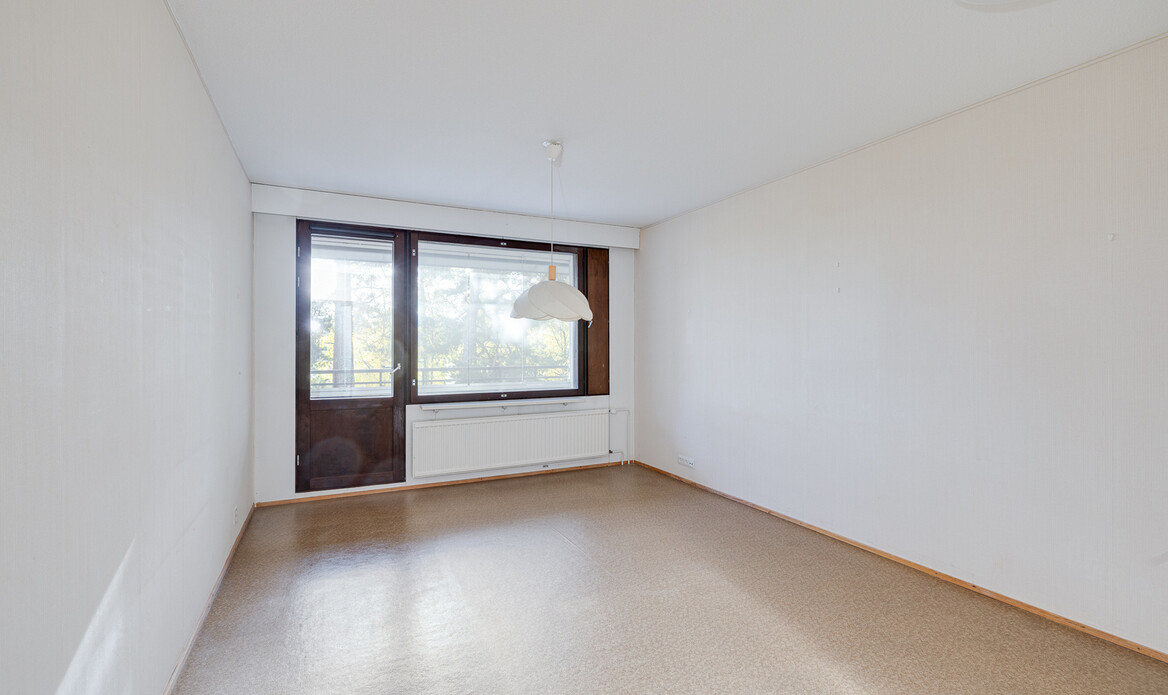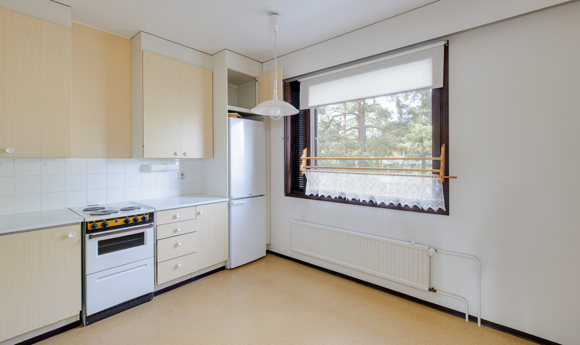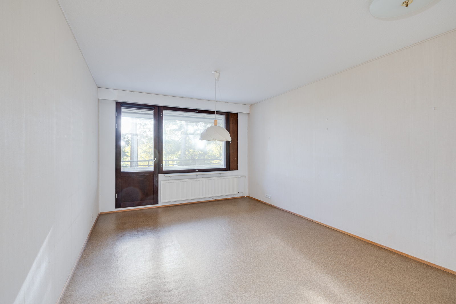 Huoneisto on alkuperäiskuntoinen ja pinnoiltaan ikäänsä nähden siisti. Jää-/pakastinkaappi uusittu jokunen vuosi sitten. Avarasta olohuoneesta käynti lasitetulle parvekkeelle, josta metsäinen näkymä.