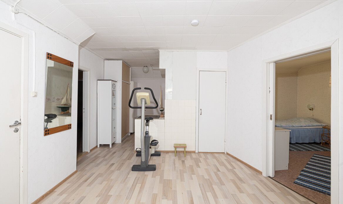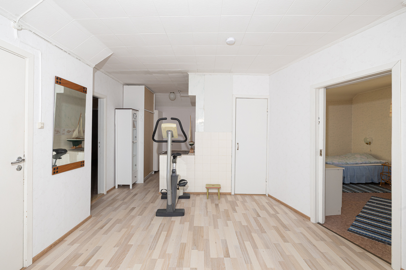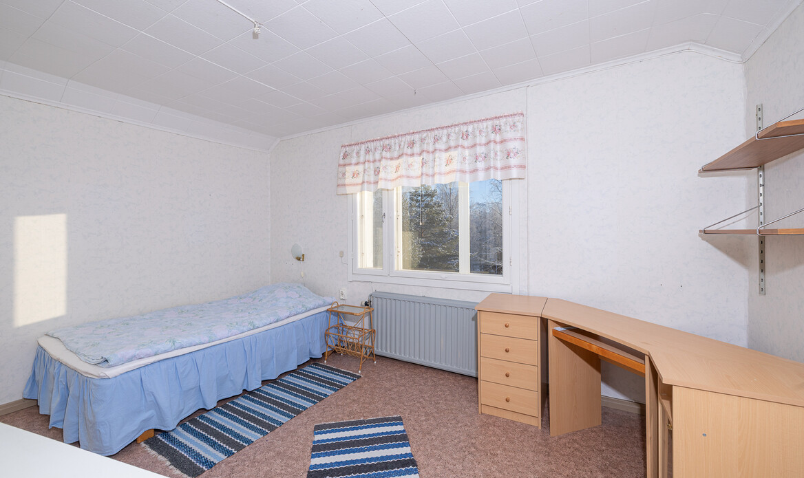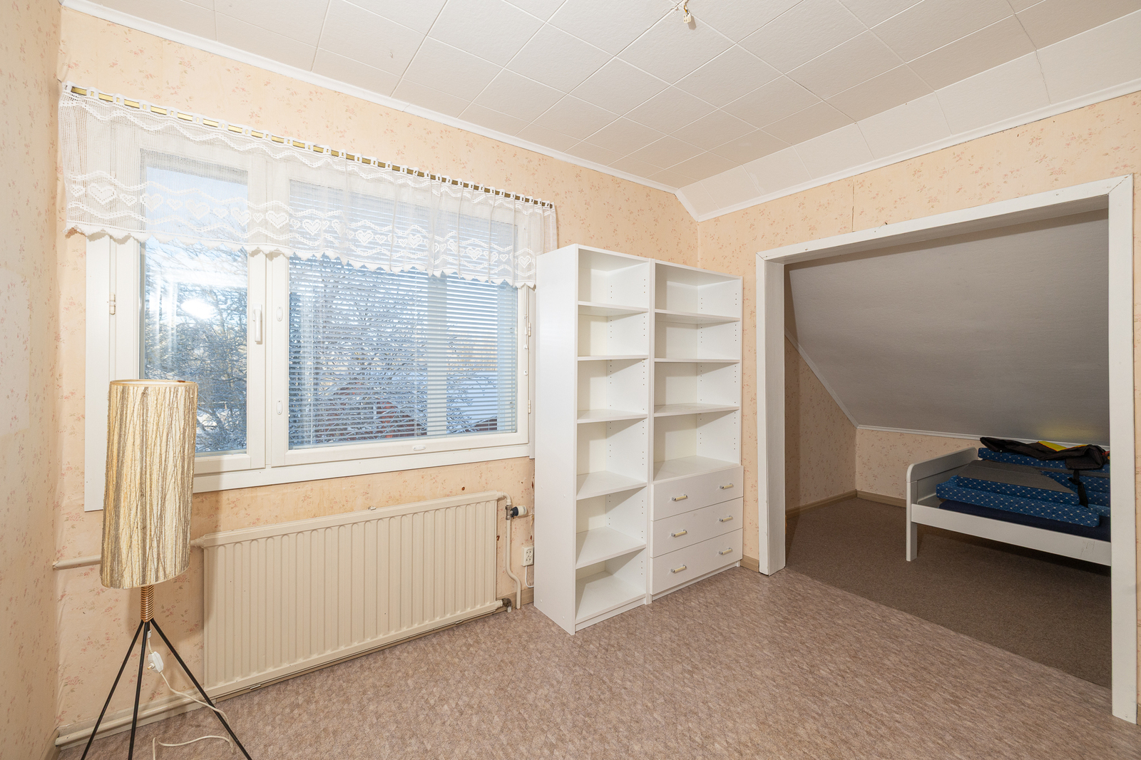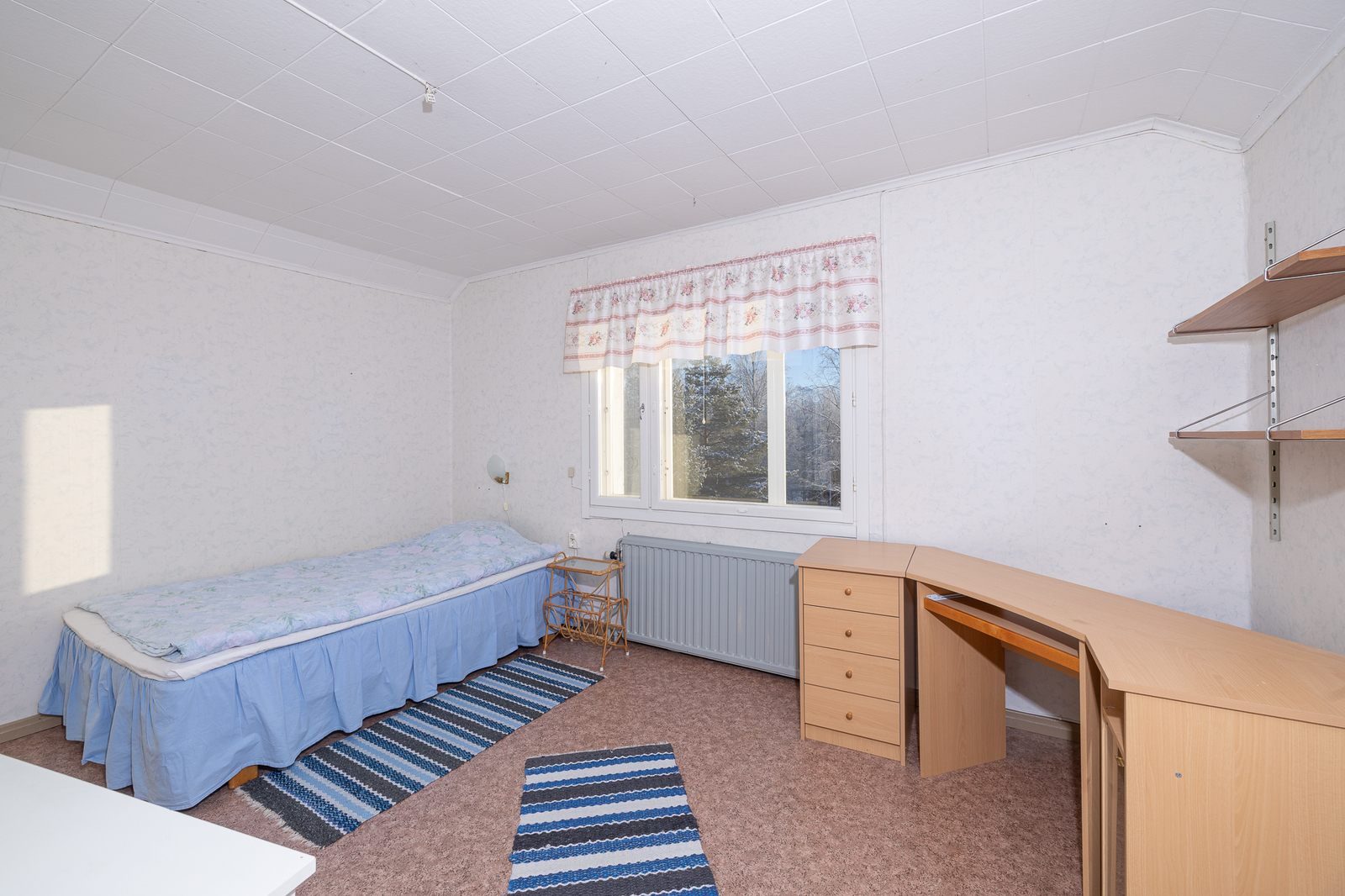 Tilojen kuvausYläkerran makuuhuoneissa muovimatto + yläkerran makuuhuoneiden välissä olevassa huoneessa laminaattilattia. Asuinkerroksen makuuhuoneessa laminaatti. x Plastmatta i sovrummen på övervåningen. Det finns laminatgolv i rummet mellan sovrummen på övervåningen. Laminat i sovrummet på bostadsvåningen. Asuinkerroksessa on erillinen keittiö, avara ruokailutila ja valoisa olohuone, makuuhuone, erillinen wc. Yläkerta tarjoaa runsaasti tilaa kahden makuuhuoneen, makuuhuoneiden välissä olevan huoneen sekä erillisen wc:n ansiosta. Kellarikerroksessa on pesuhuone, sauna ja kodinhoitotila sekä teknillinen tila varastoineen. x I bostadsvåningen finns ett separat kök, ett rymligt matrum och ett ljust vardagsrum, ett sovrum samt en separat toalett. Övervåningen erbjuder gott om plats tack vare två sovrum, Det finns laminatgolv i rummet mellan sovrummen på övervåningen och en separat toalett. I källarvåningen finns badrum, bastu samt tvättstuga och tekniskt utrymme, vilka kompletterar hemmets praktiska funktioner.