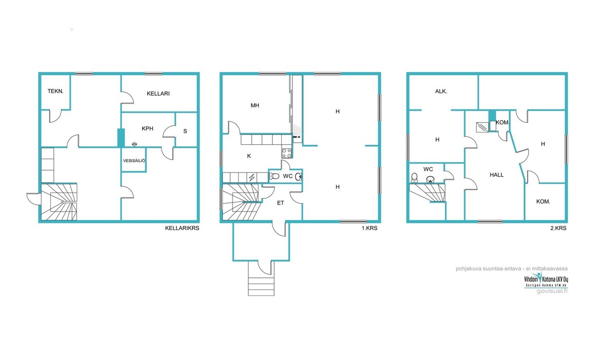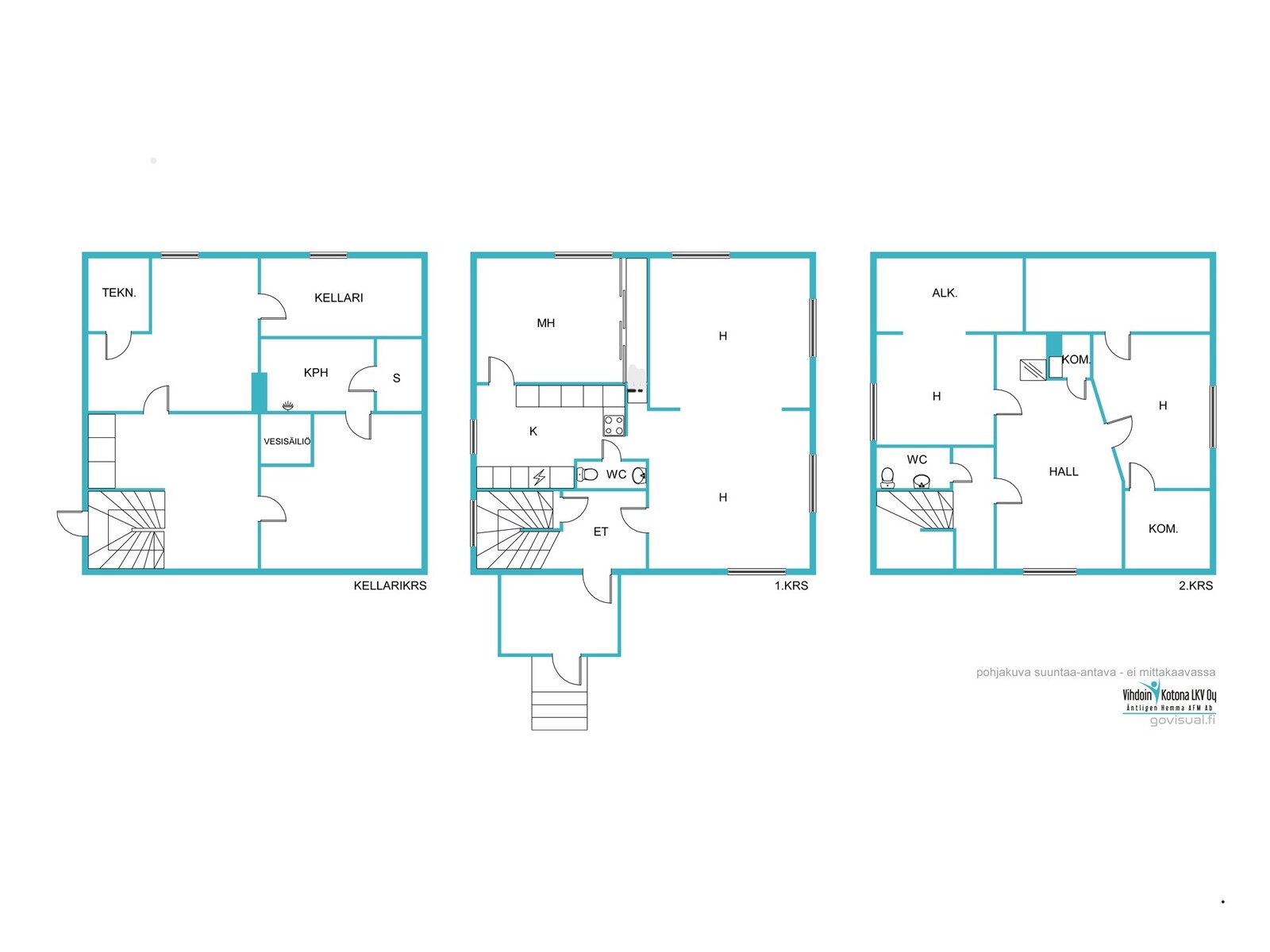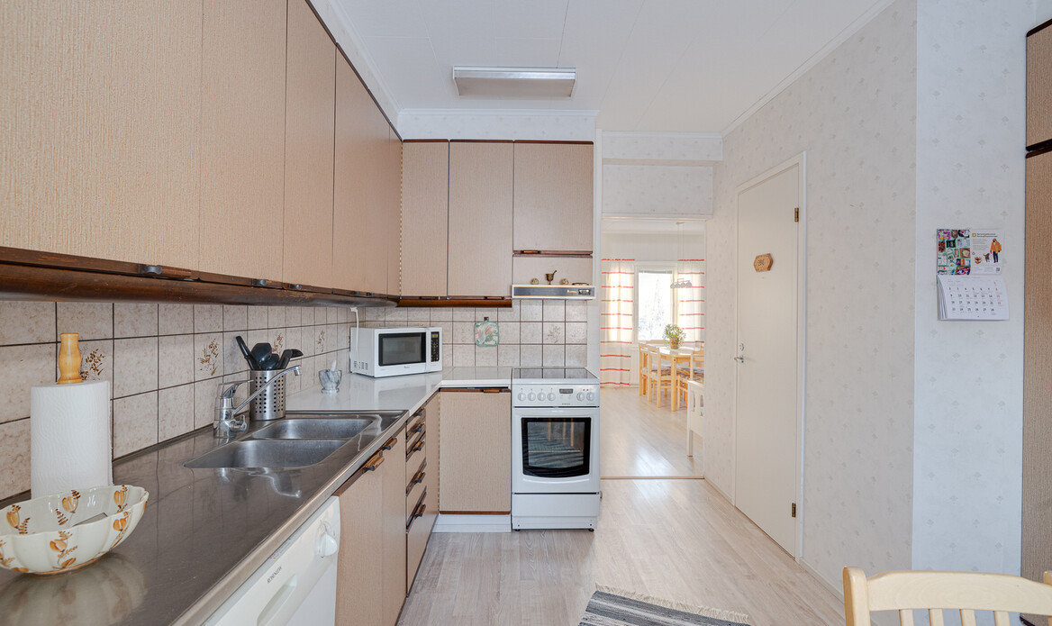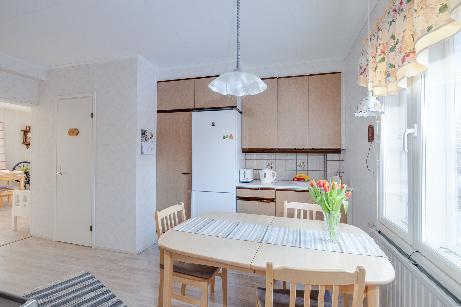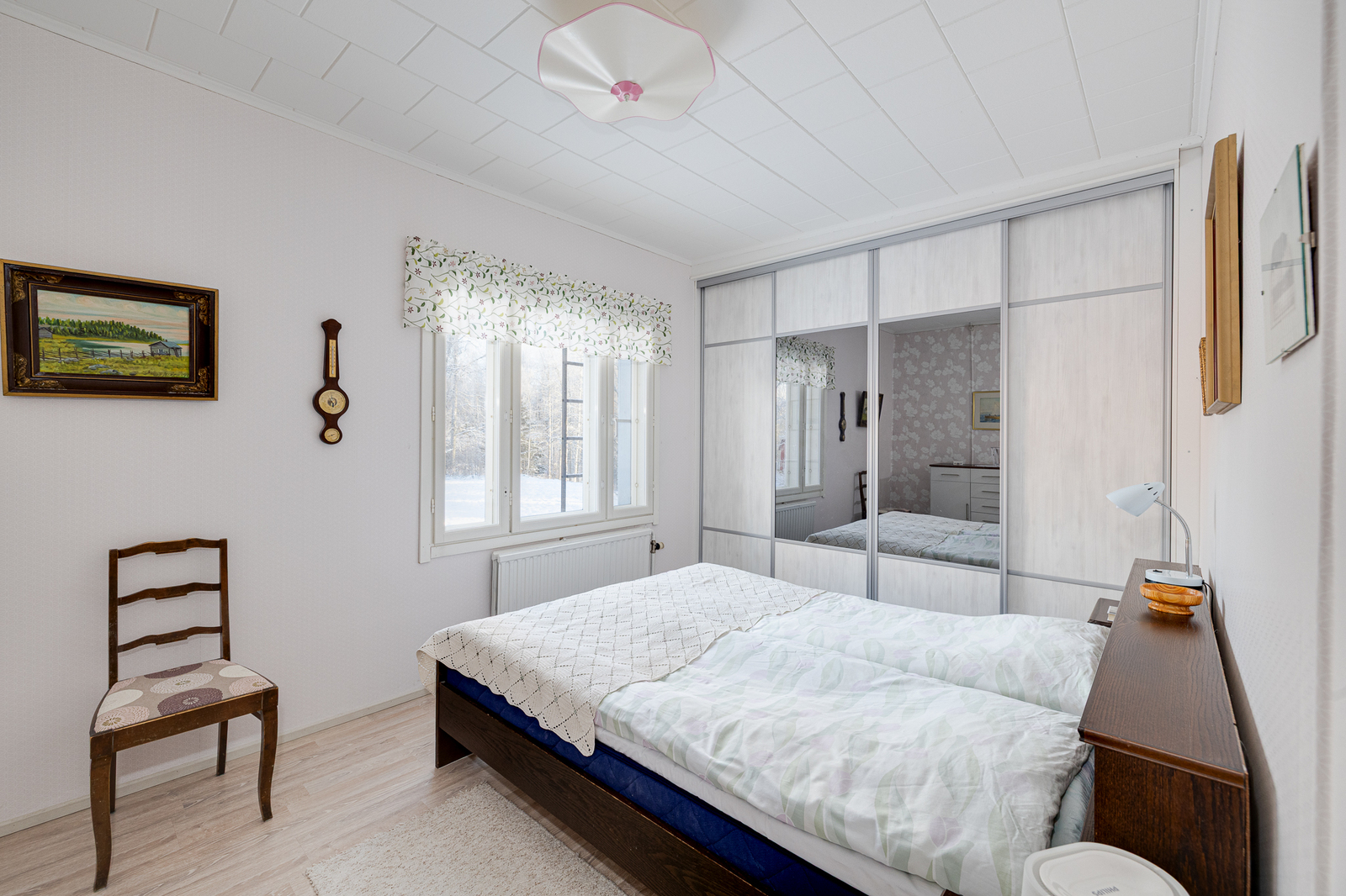 Tilojen kuvausYläkerran makuuhuoneissa muovimatto + yläkerran makuuhuoneiden välissä olevassa huoneessa laminaattilattia. Asuinkerroksen makuuhuoneessa laminaatti. x Plastmatta i sovrummen på övervåningen. Det finns laminatgolv i rummet mellan sovrummen på övervåningen. Laminat i sovrummet på bostadsvåningen. Asuinkerroksessa on erillinen keittiö, avara ruokailutila ja valoisa olohuone, makuuhuone, erillinen wc. Yläkerta tarjoaa runsaasti tilaa kahden makuuhuoneen, makuuhuoneiden välissä olevan huoneen sekä erillisen wc:n ansiosta. Kellarikerroksessa on pesuhuone, sauna ja kodinhoitotila sekä teknillinen tila varastoineen. x I bostadsvåningen finns ett separat kök, ett rymligt matrum och ett ljust vardagsrum, ett sovrum samt en separat toalett. Övervåningen erbjuder gott om plats tack vare två sovrum, Det finns laminatgolv i rummet mellan sovrummen på övervåningen och en separat toalett. I källarvåningen finns badrum, bastu samt tvättstuga och tekniskt utrymme, vilka kompletterar hemmets praktiska funktioner.